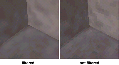 Note: if you disable texture filtering, this is known to cause texture swimming and loss of texture perspective correction. This generally occurs with older video cards.