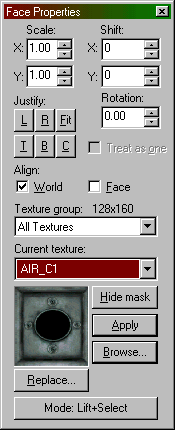 The Mark button allows you to mark (select) all texture faces that contain the selected texture. You can then adjust those faces as required (textures, surface attributes, etc). This is best used in conjunction with the Face Properties dialog. If the normal Apply Textures map tool is used, any brush with one face selected will have the new texture applied to every face of the brush.